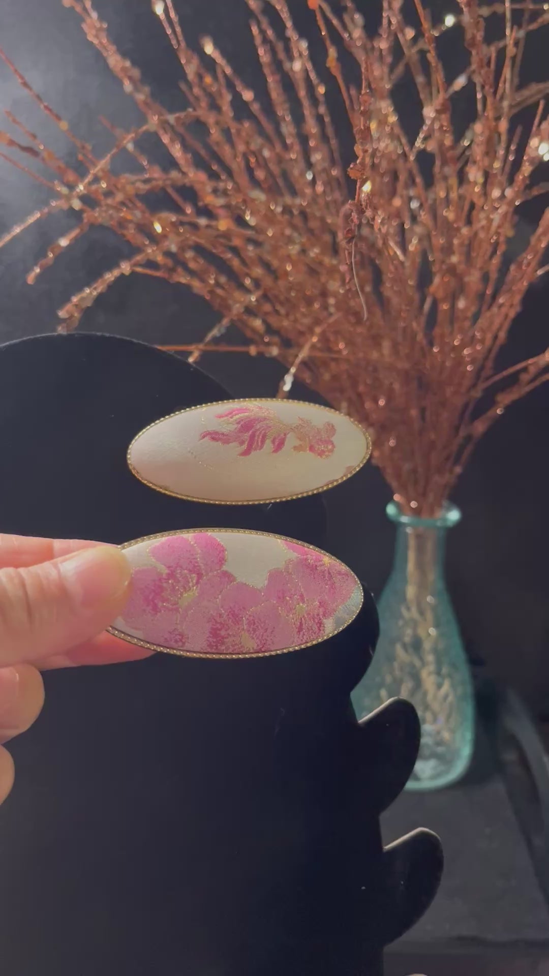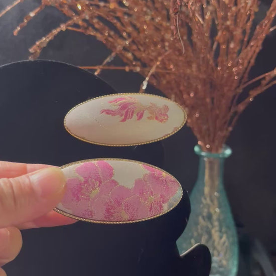 Each oval clip features genuine Song Brocade on a luminous pale pink/cream background. The designs are romantic and unique: one displays a bold peony in rich fuchsia, and the other features an elegant goldfish motif in rose pink.